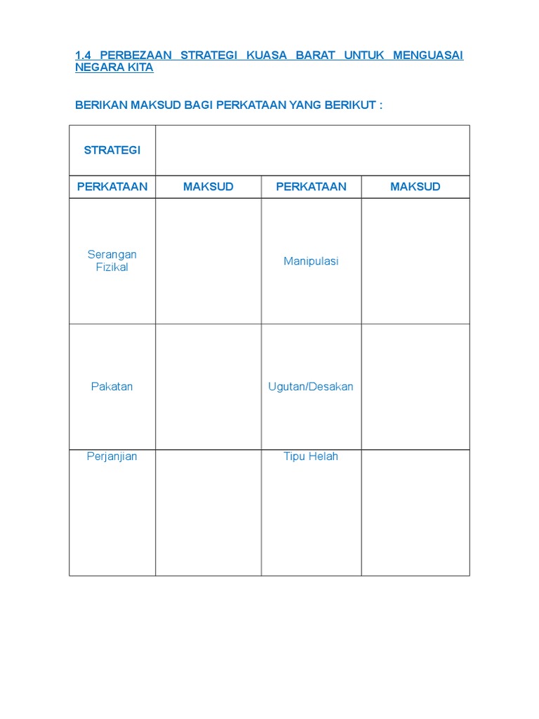 Di harapkan buku kecil ini akan berguna sebagai bahan rujukan bagi segenap patriot dan demokrat dalam perjuangan untuk menegakkan demokrasi keadilan dan kemajuan social di negara kita dewasa ini. Abad 21 34 alfatihah 93 anti jepun 36 basis 9. Contohnya portugis guna strategi menyerang semasa menjatuhkan kesultanan melayu melaka belanda guna strategi serangan fizikal perjanjian dan pakatan kuasa barat untuk. Kuasa barat strategi yang digunakan a portugis b belanda i ii iii c british i v ii vi iii vii iv tp 1 tp 4.