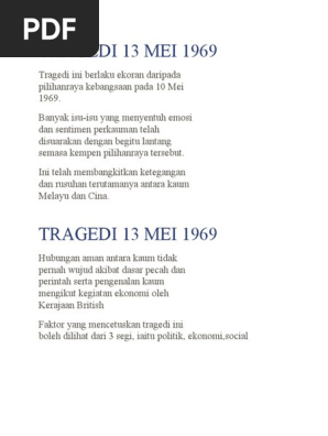 Satu tinjauan awal find read and cite all the research you need on researchgate. Dalam sejarah malaysia moden peristiwa berdarah 13 mei telah mencatatkan satu titik hitam yang pasti tidak dapat dilupakan oleh setiap rakyat di negara ini. Pertumpahan darah dan kacau bilau yang dahsyat yang berlaku pada 13 mei 1969 itu hampir menghancurkan negara. Peristiwa rusuhan kaum yang berlaku pada 13 mei 1969 merupakan peristiwa hitam dalam sejarah malaysia.