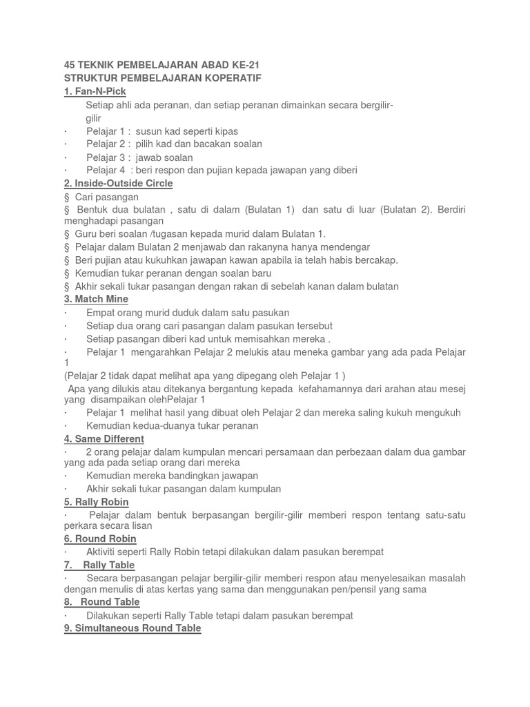 45 teknik pembelajaran abad 21 yang boleh dijadikan rujukan untuk guru lakukan di dalam kelas 1. Pembelajaran abad 21 merupakan isu pendidikan paling trending di malaysia untuk tahun 2015 hingga tahun 2016 ini. Berikut merupakan 47 aktiviti pembelajaran abad ke 21 pak 21 yang telah saya sediakan dalam bentuk grafik iaitu gambar bersaiz a4 format png yang mempunyai resolusi kualiti tinggi 4490 x 3175. Dibawah dikongsikan 45 teknik pdpc abad ke 21 yang boleh digunakan oleh para guru dalam kelas struktur pembelajaran koperatif.