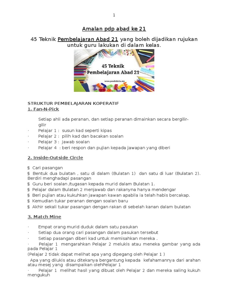 45 teknik pembelajaran abad 21. Pelajar 1. Pelaksanaan berperingkat bermula daripada penyediaan bilik kelas susunatur dan keperluan fizikal dalam bilik darjah abad 21 kemudian diteruskan dengan penyediaan rancangan mengajar dan pelaksanaan p p abad 21. 47 aktiviti ini sesuai dan boleh dilaksanakan dalam aktiviti pembelajaran dan pemudahcaraan pdpc. Pdpc abad 21 struktur pembelajaran koperatif 1.
