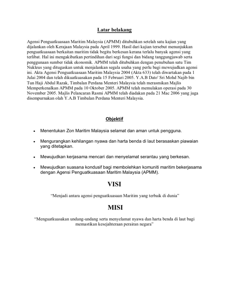 Hari bersama media beri pendedahan tugas cabaran pertahan perairan negara berpegang kepada moto mengawal melindung menyelamat agensi penguatkuasaan maritim malaysia apmm kini menjadi tunjang pertahanan perairan negara yang semakin digeruni sejak beroperasi pada 2005 apmm wilayah maritim timur mencapai banyak kejayaan dalam memastikan perairan negara bebas daripada ancaman asing dan. Pengarah maritim negeri jusa c agensi penguatkuasaan maritim malaysia apmm pejabat wilayah sabah dan wp labuan kementerian dalam negeri bayview court no 1 jalan burung upih signal hill beg berkunci 2059 88999 kota kinabalu pa puan farah f. Agensi hendaklah tertakluk kepada akta ini digunakan khidmatnya di dalam zon maritim malaysia bagi memelihara. 02 merumuskan dan mengadakan mekanisme bagi mengesan menyiasat dan mencegah salah laku oleh seseorang pegawai.