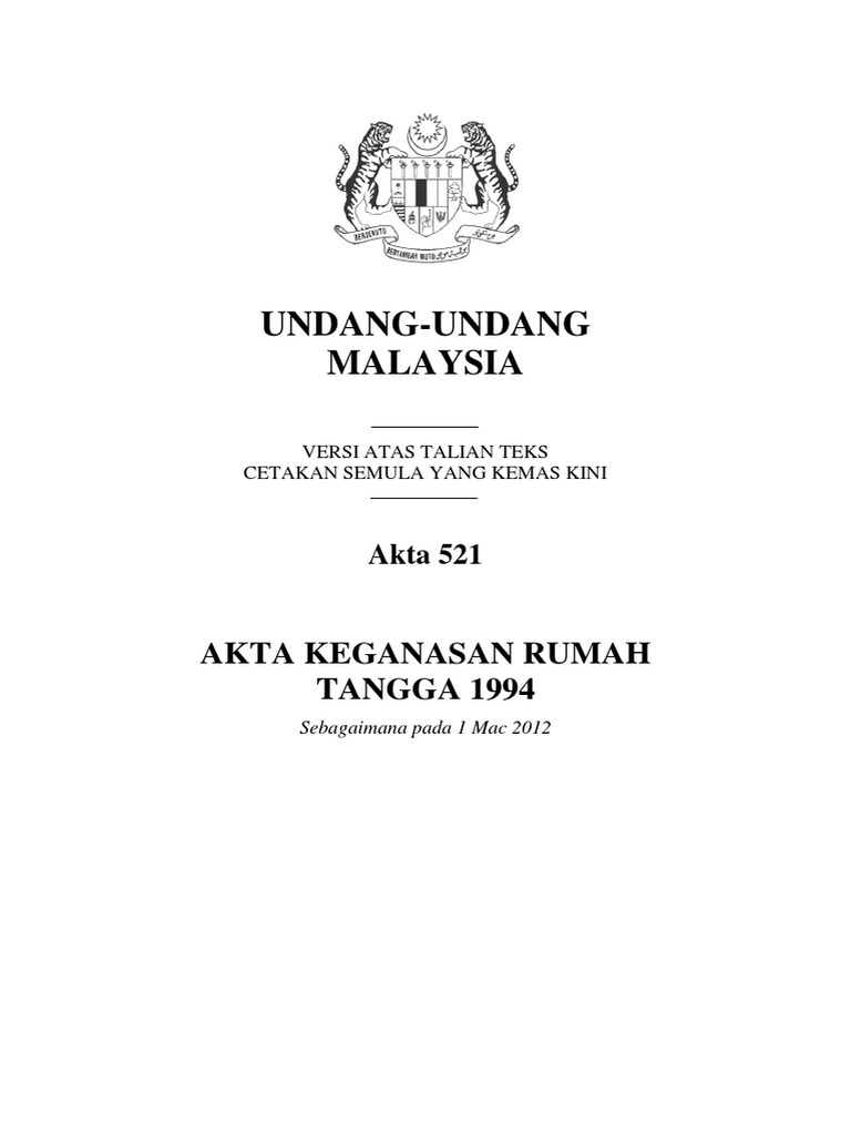 Akta yang berkuat kuasa pada 1 jun 1996 ini bertujuan. 1 4 kerajaan telah mengambil langkah proaktif untuk menggubal akta keganasan rumah tangga 1994 akta 521 dengan mengambil kira pandangan daripada agensi berkaitan serta pertubuhan bukan kerajaan ngo. Akta ini menjenayahkan keganasan rumah tangga melindungi hak dan keselamatan pemandiri keganasan rumah. Akta 521 akta keganasan rumah tangga 1994 telah menulis berikut merupakan skop dan definisi keganasan rumah tangga.