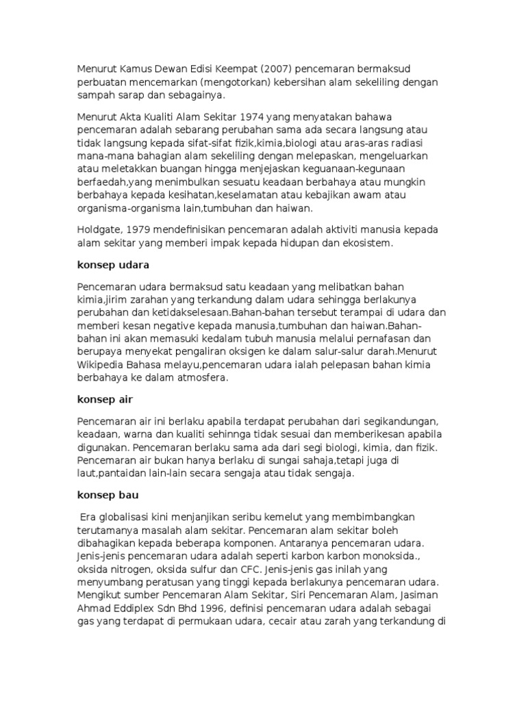 Takrifan pencemaran yang lebih bermaklumat adalah menurut akta kualiti alam sekitar akas 1974 yang menyatakan bahawa pencemaran ialah perubahan sama ada secara langsung atau tidak langsung kepada sifat sifat fizik kimia biologi atau aras sinaran mana mana bahagian alam sekeliling dengan melepaskan mengeluarkan atau meletakkan buangan hingga menjejaskan kegunaan kegunaan berfaedah yang.