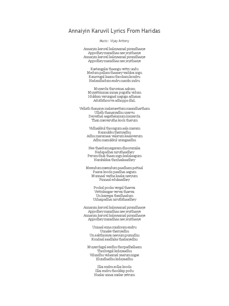 Annaiyin karuvil mp3 song by shankar mahadevan from the tamil movie haridas. Annaiyin karuvil kalaiyamal lyrics அன ன ய ன கர வ ல கல ய மல ப றந த ய அப ப த மன த ந ஜ ய த த ய 2 கஷ டங கள த ங க வ ற ற உண ட ம ட ம பள ளம த ன வ ழ க க. Annaiyin karuvil song lyrics from the tamil movie haridas music by vijai anthony for free on junolyrics in online. Haridas 2013 film artists.