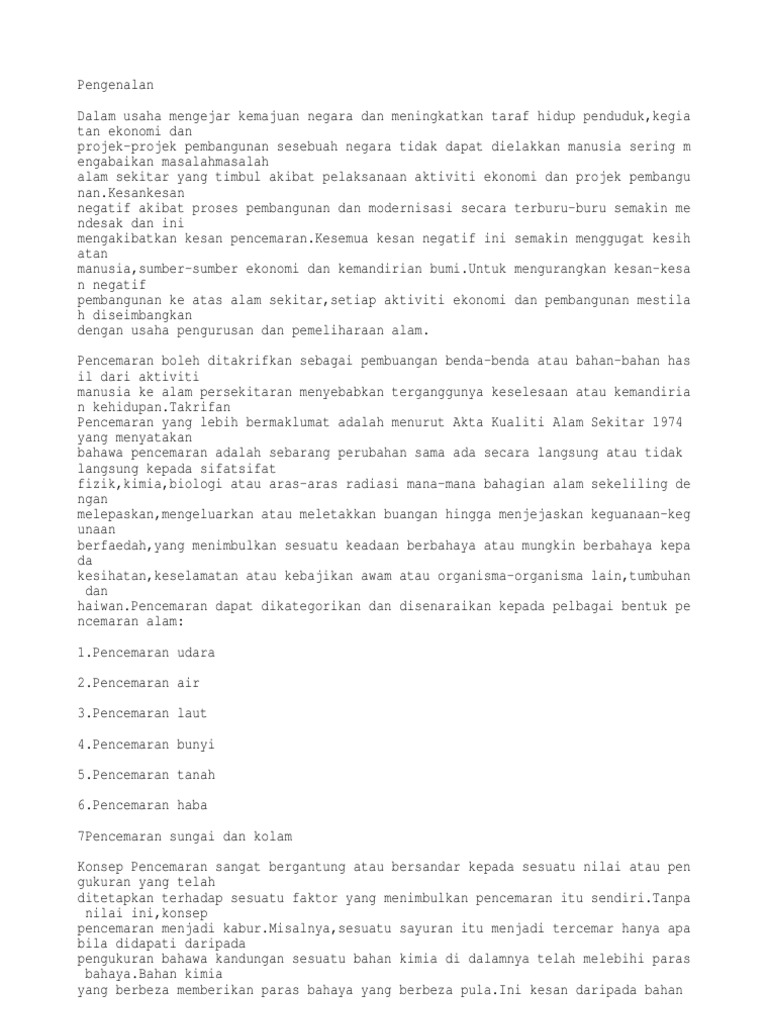 Artikel pencemaran alam sekitar di malaysia. Kesimpulan malaysia sememangnya sebuah negara yang berkembang pesat serta maju dalam pelbagai bidang namun dalam kepesatan pertumbuhannya itu ramai yang tidak menyedari bahawa ia juga membawa kesan sampingan terhadap alam sekitar kegiatan kegiatan perusahan atau perkilangan asap asap menyebabkan pencemaran udara dan pembuangan toksik menyebabkan pencemaran air selain itu kegiatan pembangunan. Sampah di malaysia yang biasanya terkumpul di tempat pembuangan akhir tpa dan hanyut ke laut kerana faktor cuaca. Orang awam terhadap pemuliharaan alam sekitar di pulau pinang dan kuala lumpur berada pada tahap rendah. Kepesatan teknologi dan pembangunan di seluruh dunia banyak memberi manfaat dan memudahkan manusia.