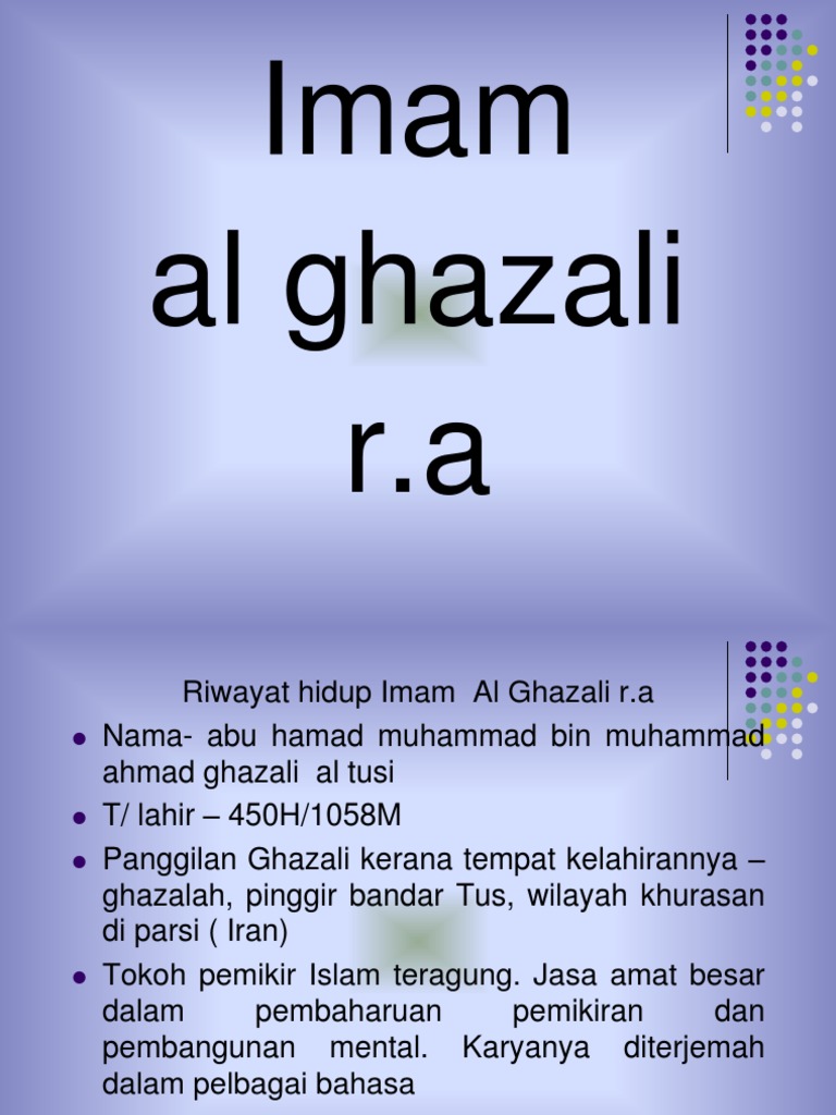 Berikut adalah sebagian sisi kehidupannya. ابو حامد محمد ابن محمد الغزالی yang dikenali sebagai algazel di dunia barat adalah salah seorang ilmuwan islam. Namanya abu hamid ibn muhammad ibn muhammad al tusi al shafi i al ghazali dikenal dengan imam al ghazali. Beliau lebih dikenali dengan panggilan al ghazali kerana dinisbahkan kepada nama kampung tempat kelahirannya iaitu ghazalah yg terletak dipinggir bandar tusi di dalam wilayah khurasan parsi iran.