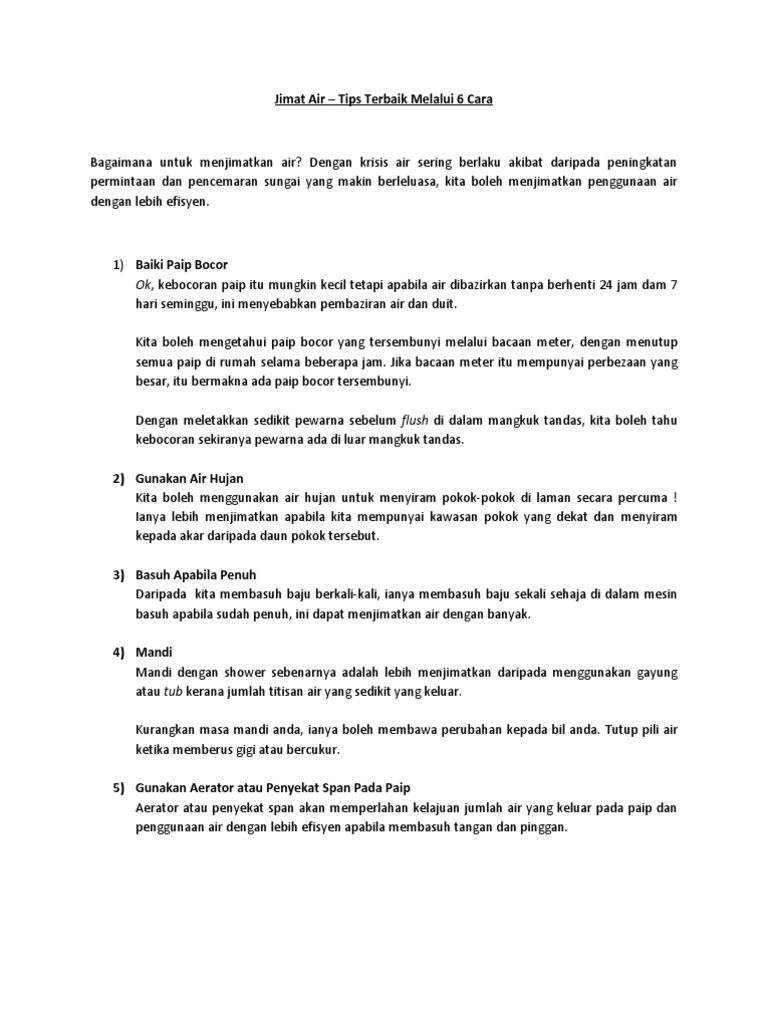 Dengan populasi manusia yang semakin bertambah maka keperluan terhadap bekalan air bersih juga sudah tentu meningkat. Cara penjimatan penggunaan air cikgu hailmi rabu julai 24 2013. Memandangkan permintaan air bersih kian meningkat sedangkan sumbernya semakin berkurangan maka langkah penjimatan dan pemuliharaan perlu dilakukan. Kawal penggunaan pam tandas.
