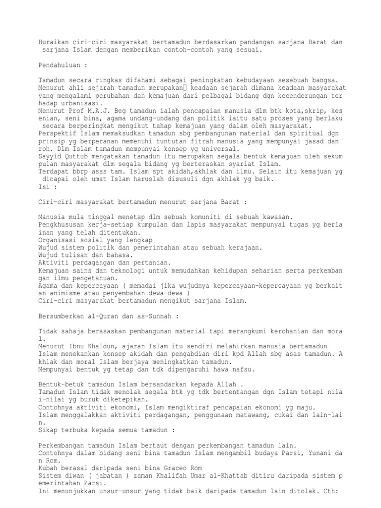 Huraikan ciri ciri masyarakat bertamadun berdasarkan pandangan sarjana barat dan sarjana islam dengan memberikan contoh contoh yang sesuai. Masyarakat bertamadun mempunyai ciri ciri perbandaran pengkhususan kerja organisasi sosial sistem tulisan agama dan kepercayaan petempatan kekal kemajuan sains dan teknologi serta sistem pemerintahan. Negara yang tersusun rapi.