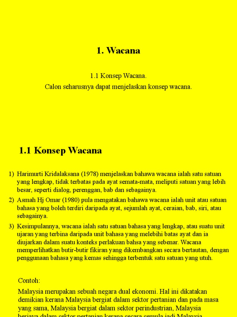Menurut beliau lagi terdapat juga ciri ciri yang lain termasuklah tujuan sesuatu wacana penerimaan oleh pendengar atau pembaca maklumat yang terkandung keadaan yang mewujudkan wacana dan interteks atau peranan wacana wacana lain yang membantu pendengar atau pembaca memahaminapa yang didengar atau dibaca. 1 3 jenis penanda. Wacana dapat dipahami sebagai sebuah satuan bahasa tertinggi dan berada pada tingkatan di atas kalimat. Wacana bab 1 2.