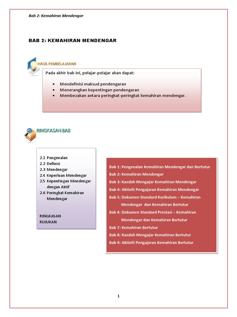 Tajuk 1 kemahiran mendengar dan bertutur. Kemahiran mendengar merujuk kepada keupayaan pelajar mendengar dengan teliti dan memahami perkara yang didengar dalam pelbagai situasi pengucapan seperti cerita arahan perbualan soal jawab laporan berita dan perbincangan. Tajuk 1 kemahiran mendengar dan bertutur bullet konsep bullet objektif bullet proses dan bentuk. Dari segi kenyataannya aktiviti mendengar wujud dalam situsasi yang berbeza dan dengan penutur yang berbeza pula.