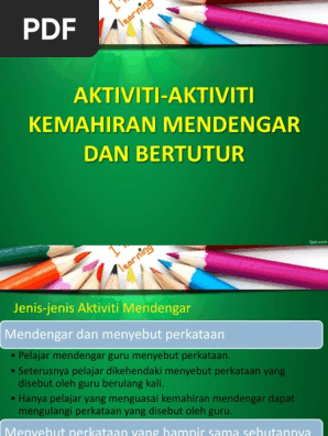 Contoh aktiviti kemahiran mendengar dan bertutur. Chew fong peng abdul jalil othman. Misalnya kemahiran mendengar digabungjalinkan dengan kemahiran bertutur. Terdapat dua jenis aktiviti yang telah dijalankan dalam kumpulan kami yang terdiri daripada joaeen cham mohammad faisal dan mohammad aiman hakimi dalam aktiviti. Kemahiran mendengar hendaklah dijalankanbersama sama kemahiran lain latihan yang dijalankan hendaklah berteraskansesuatu sesuatu tugasan yang boleh membawakepada sesuatu aktiviti setiap aktiviti dan kemahiran membolehkan muridmenunjukkan kefahaman mereka melalui bahasa aksi atau cara cara lain yang berkesan guru harus memberi peluang kepada murid berlatihmendengar sebanyak yang mungkin dan.