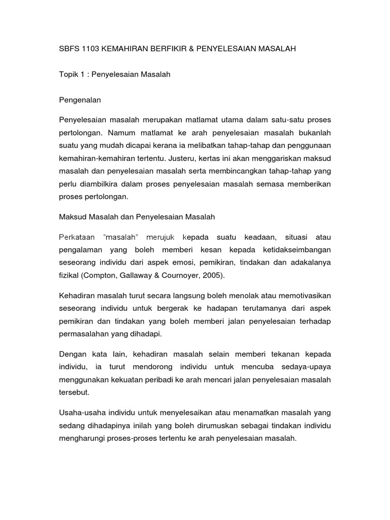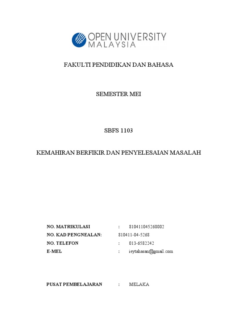 Kemahiran berfikir diterapkan kepada pelajar melalui soalan soalan aras tinggi aktiviti aktiviti yang menggalakkan pemikiran dan penyelesaian masalah serta kaedah kaedah pengajaran yang boleh mendorong ke arah meningkatkan kemahiran berfikir. Kemahiran berfikir dan penyelesaian masalah sbsf 1 103 malu rendah diri lalu menjadikan kanak kanak ini sebagai tempat untuk melepaskan perasaan marah bagi kanak kanak cacat oku yang. Sbfs1103 kemahiran berfikir dan penyelesaian masalah. Kepenting kemahiran berfikir adalah dari a spek keupayaan memindahkan kemahiran yang sudah dipelajari kepada situasi yang lain atau baru kemahiran berfikir penting dalam proses meninggikan keupayaan menangani masalah kerana melaluinya hal demikian individu dapat mengawal menentukan arah dan mengukur kemajuan tindakan bahkan juga dapat menggunakan pengetahuan yang telah dipelajari dgn lebih.