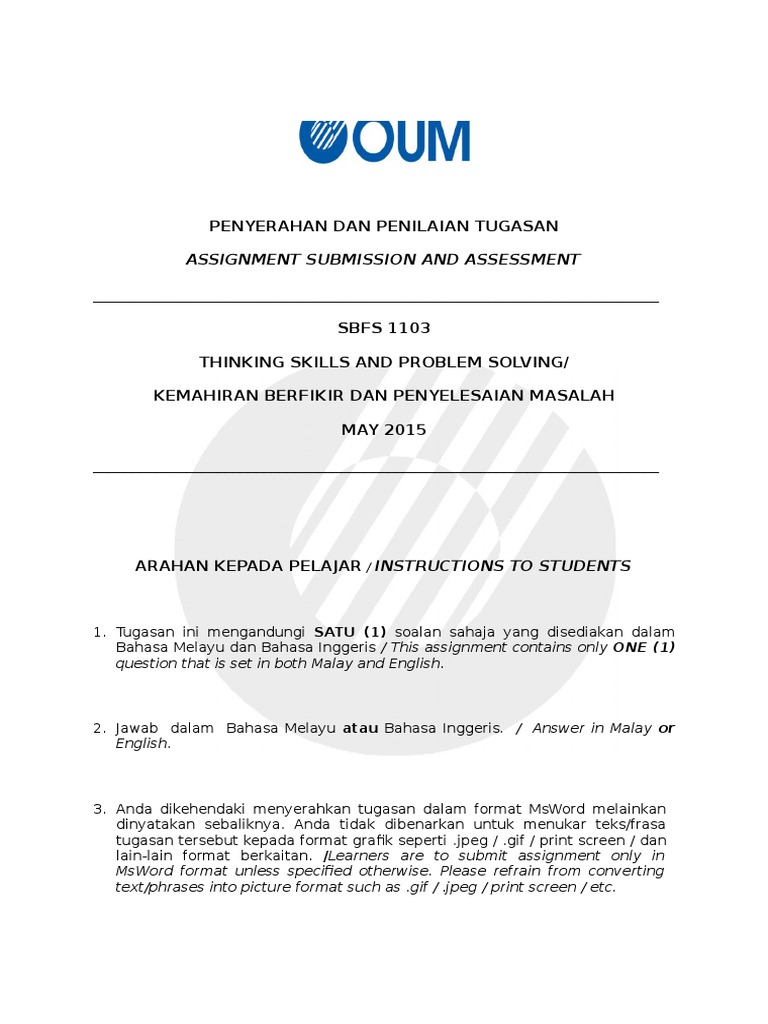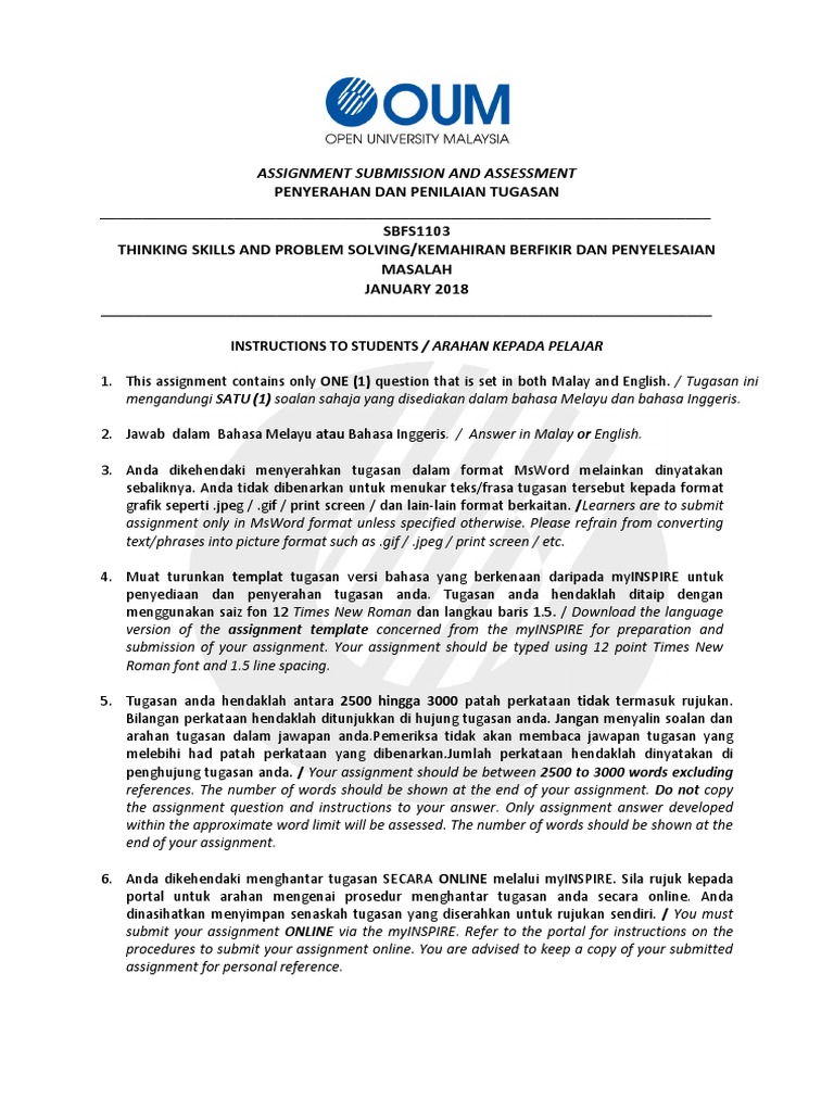 Contoh assignment kemahiran berfikir dan penyelesaian masalah. Guru perlu membimbing dan merangsang perbincangan penyelesaian masalah. Memberi kemahiran kepada pelajar supaya berfikir secara kritis dan boleh menghasilkan ideaidea baharu. Calon dikehendaki menganalisa data data tersebut untuk menyelesaikan masalah yang dikemukakan. Setiap saat manusia akan berfikir untuk menjalani kehidupan seharian tidak kira pada sesiapa sahaja pemikiran merupakan suatu proses untuk menyelesaikan masalah menjana idea dan sebagainya.