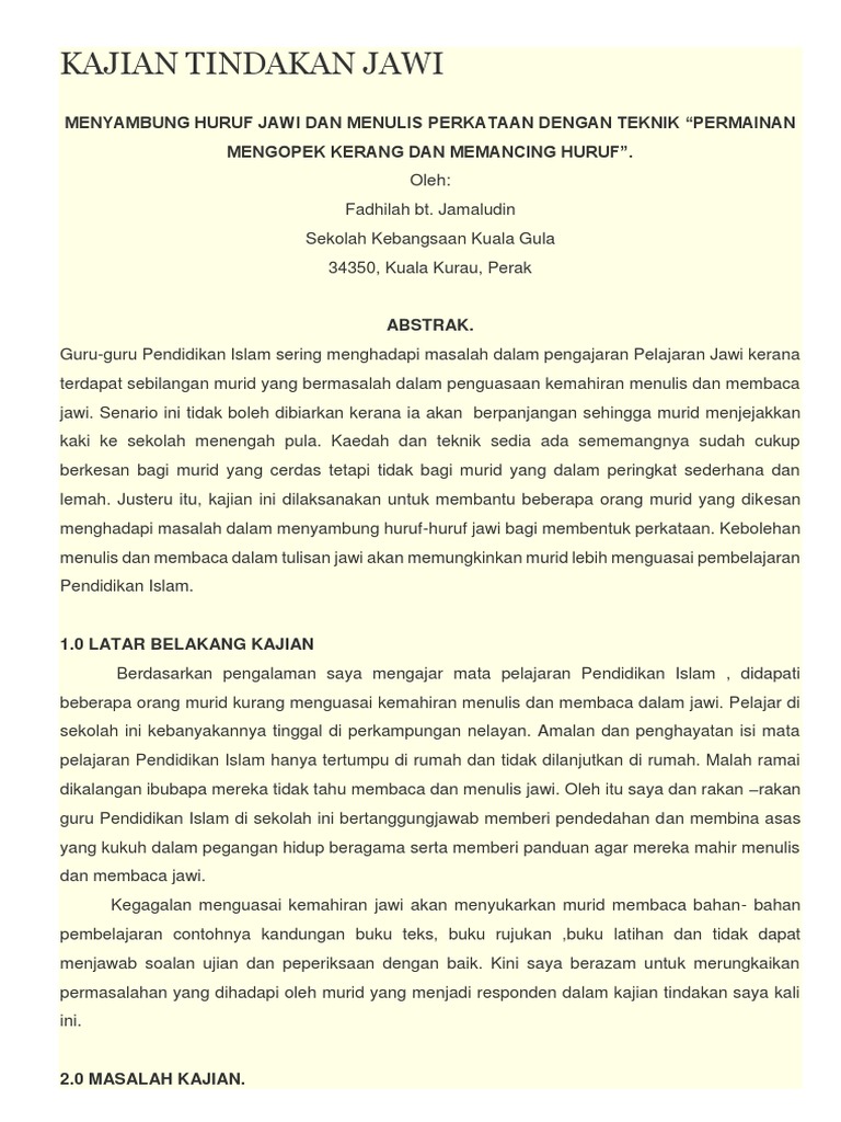 Kemahiran menghafaz surah mohd hazri bin abdul rani sk ewa langkawi abstrak hafazan sememangnya satu bidang yang amat ditakuti oleh murid murid saya. 13 pages 45 views. Contoh kajian tindakan jawi contoh kajian tindakan tulisan pelajar manajemen pendidikan islam pendidikan islam sejarah pendidikan islam kajian tindakan kajian tindakan pismp kajian tindakan penggunaan ict di sekolah ren yayasan pendidikan islam khairul. Kajian ini akan melibatkan semua murid tahun empat skdn yang berjumlah 115 orang sebagai sampel kajian soal selidik dan pengumpulan data dan 7 orang guru pendidikan islam terlatih sebagai responden untuk temubual dan 20 orang murid lemah jawi yang telah dikenalpasti melalui ujian yang dilaksanakan oleh gpi sebagai sampel kepada aktiviti pemulihan jawi.