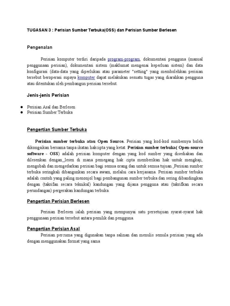 Contoh perisian sumber terbuka. Ini seterusnya meningkatkan kualiti perisian dan penyertaan aktif masyarakat juga digalakkan pada masa yang sama syarikat syarikat yang mempromosikan perisian proprietari kini menggunakan perisian open source kerana ciri ciri yang disebutkan di atas. Sumber sangat terbuka dari komunitas ditandai dengan diskusi kepandaian yang lebih terbuka memakai alat laksana wiki forum dan milis dari seringkali di lingkungan perusahaan. Perisian sumber terbuka dibangunkan oleh pembangun perisian bagi memberi alternatif kepada pengguna untuk menggunakan sesuatu perisian dengan kos percuma disamping memperoleh fungsi yang setanding dengan perisian berbayar. Perisian sumber terbuka open source software oss adalah perisian komputer dengan yang kod sumber yang disediakan dan dilesenkan dengan lesen di mana pemegang hak cipta memberikan hak untuk mengkaji mengubah dan mengedarkan perisian bagi semua orang dan untuk semua tujuan.
