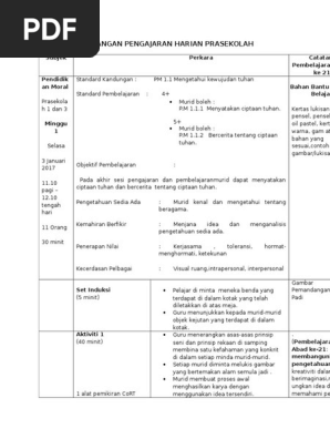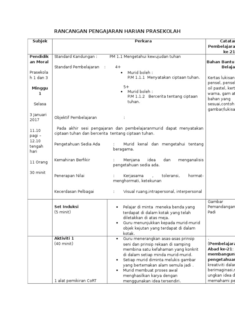 Contoh Rancangan Pengajaran Harian Pendidikan Moral Prasekolah