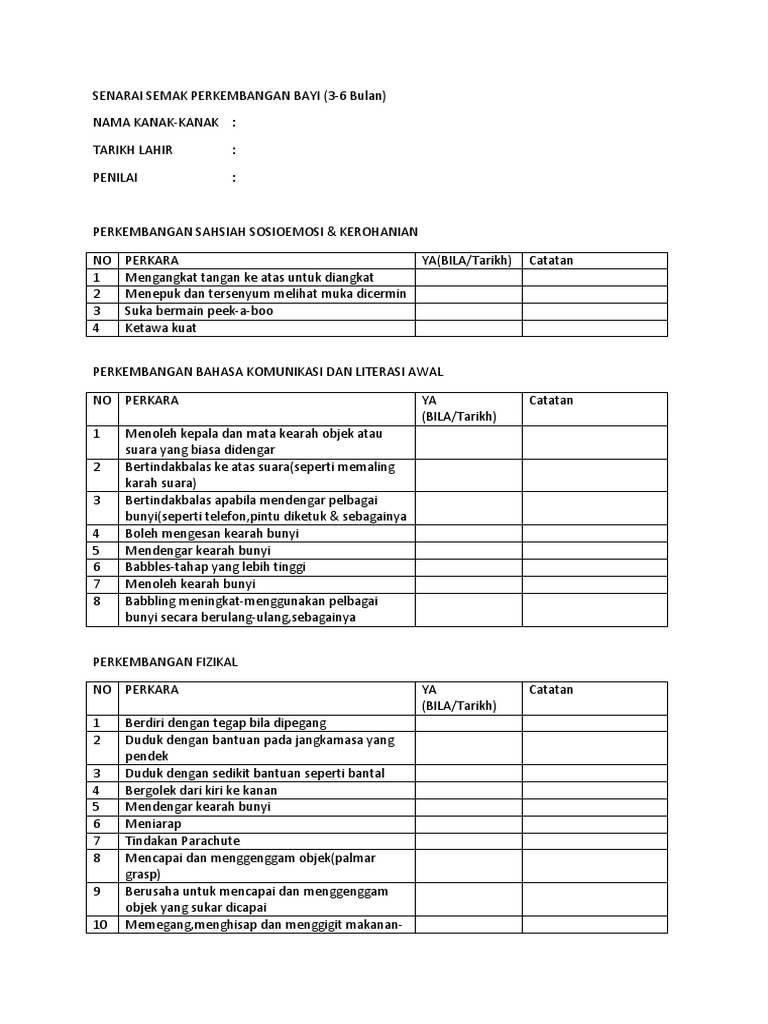 Contoh senarai semak perkembangan fizikal kanak kanak. Sesuatu tingkah laku dapat diperhatikan. Muat turun semua fail di sini. Fizikal 1 bkla 2 ampl 2 ssek 2 ke 1 dpdp 1 pemakanan 1. Senarai semak pengesanan perkembangan bayi dan kanak kanak berumur 0 hingga 6 tahun.