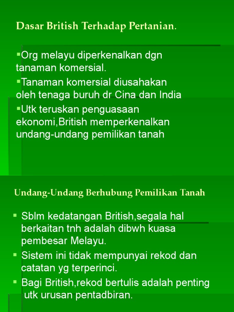 Undang undang berhubung dengan tanah. Memahami dasar dasar british berkaitan ekonomi. Menerangkan kegiatan ekonomi tradisional dan ekonomi moden di tanah melayu 2. Dasar british terhadap pertanian.