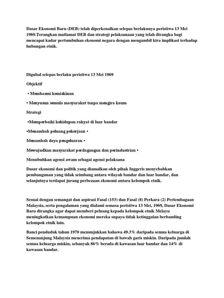 4 isi x 2 markah 8 markah halaman 10 daripada 12. Ini menyebabkan ketidakseimbangan pendapatan yang menimbulkan rasa cemburu antara kaum. Matlamat utama dasar ini diperkenalkan ialah bagi mewujudkan perpaduan negara dengan mengurangkan perbezaan ekonomi sosial kebudayaan penempatan dan sebagainya. Pelan tersebut dikenali sebagai dasar ekonomi baru deb yang telah diperkenalkan oleh yang amat berhormat tun abdul razak semasa pentadbiran beliau sebagai perdana menteri malaysia yang kedua pada 1970.