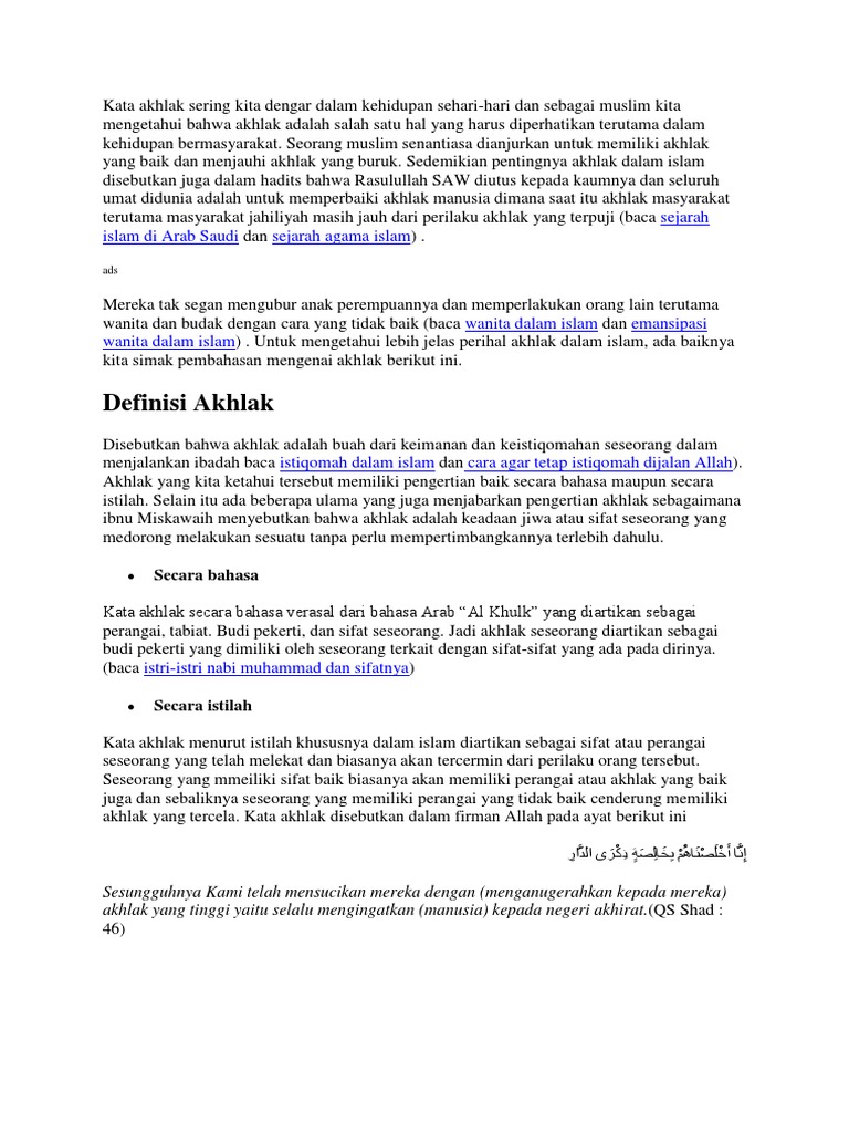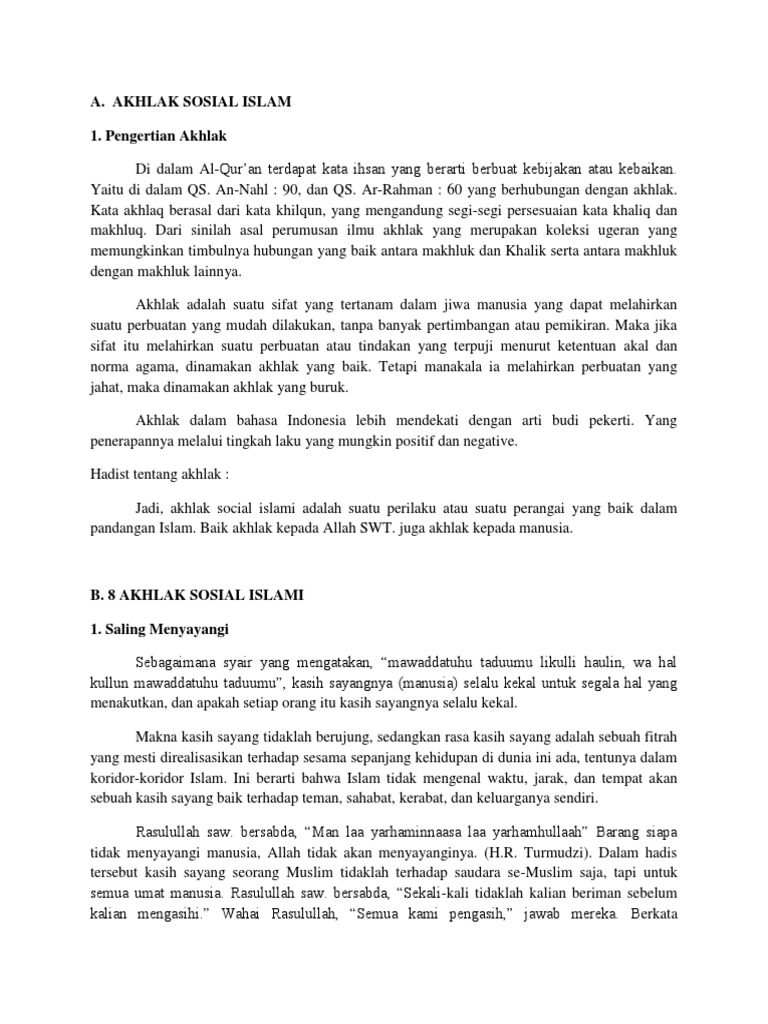 Ini bererti islam tanpa akhlak seperti rangka yang tidak mempunyai isi atau jasad yang tidak bernyawa. Adapun sistem nilai tersebut antara lain adalah ajaran islam dengan al quran dan sunnah rasul sebagai sumber nilainya dan ijtihad sebagai metode berfikir islami. Ini kerana kedua duanya itu lebih menekankan kepada aspek tindakan dan tingkah laku lahiriah manusia dalam hubungan sesama manusia berdasarkan kepada pemikiran dan pandangan umum sesuatu kumpulan masyarakat pada sesuatu masa dan sesuatu tempat yang tertentu. Pengertian akhlak macam macam akhlak dan dalil tentang akhlak adalah bagian dari ceramah agama dan kajian islam dengan pembahasan k itab الدروس المهمة لعامة الأمة pelajaran pelajaran penting untuk segenap umat pembahasan ini disampaikan oleh syaikh prof.