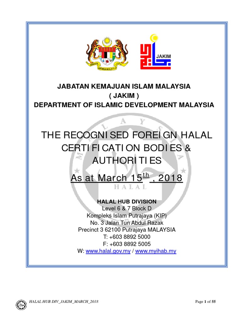 Department of islamic development malaysia jakim halal hub division. 603 8318 7044 website. 2 5 oct 2007 page 1 of 10 department of islamic development malaysia jakim halal hub division g 3rd floor block 2200 enterprise 3 building persiaran apec 63000. 3 jalan tun abdul razak presint 3 62100 putrajaya malaysia. The rapid development of halal certification in malaysia has also prompted the department of islamic development malaysia jakim to extend its halal section into a much bigger organisation in 2005 officially named jakim s halal hub.