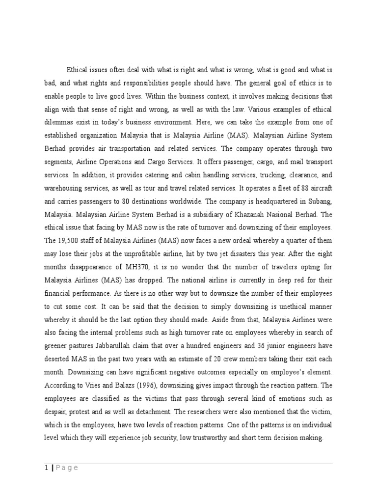 Ethical issues in malaysia airlines. Following the catastrophic losses of flights mh370 over the indian ocean and mh17 over ukraine malaysia airlines mas has received a bailout of nearly 1 2 billion from the malaysian government. Malaysia airlines mas has announced their new business plan for year 2012 aiming to restore their profitability on the premium sector as to become the preferred premium carrier. This airline is founded in 66 years ago on 1 may 1947 as the name of malayan airways then after. There are also ethical issues related to search efforts and the sharing of information about the flight by the malaysian and other governmental authorities.