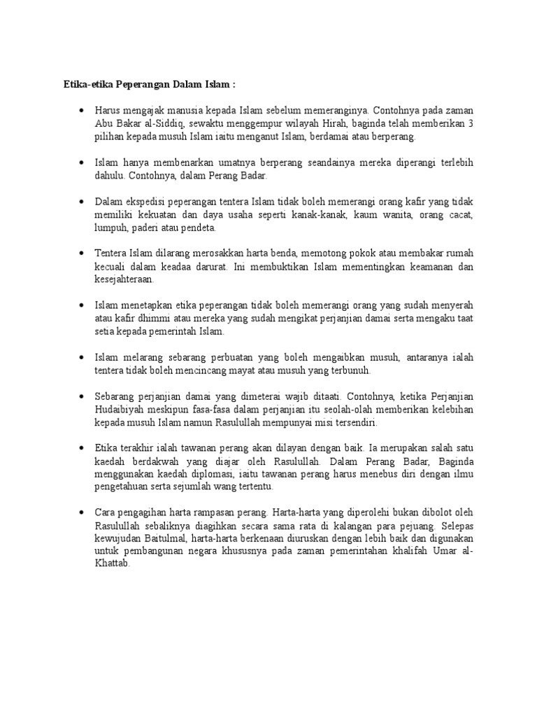 Etika peperangan dalam islam pdf. Etika peperangan dalam islam secara umumnya etika peperangan dlm islam terbhg kpd 3 mengikut situasi iaitu etika sebelum peperangan semasa peperangan dan selepas peperangan islam telah mengariskan prinsip prinsip umum dlm berjihad atau berperang yg mesti dipatuhi oleh tentera islam ketika berperang. Utusan publication 1996 19. Dalam kitab veda 1500 s m mengandungi ajaran etika di samping dasar ketuhanannya etika yang 11mustafa haji daud etika pengurusan kuala lumpur. Ada tahapan yang jelas sebelum perang dilaksanakan.