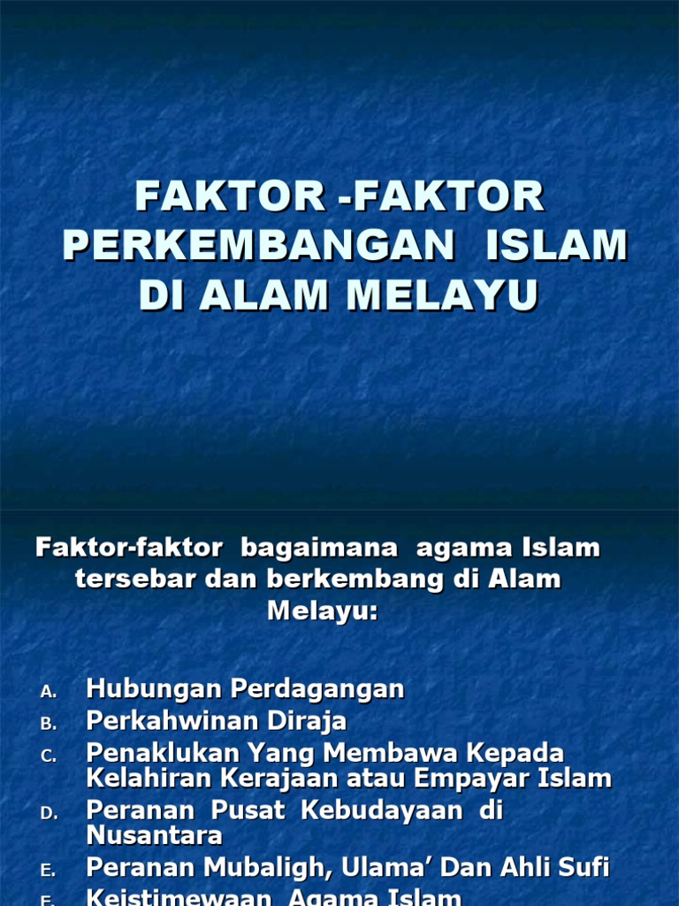 Para pedagang memang memainkan peranan penting dalam penyebaran islam di tanah melayu. Bersama dengan kedatangan islam itu pula wujudnya keamanan ilmu pengetahuan. Faktor faktor perkembangan islam dialam melayu pendahuluan agama islam mula berkembang di alam melayu dalam abad ke 13 masihi. Faktor faktor perkembangan islam tanah melayu.