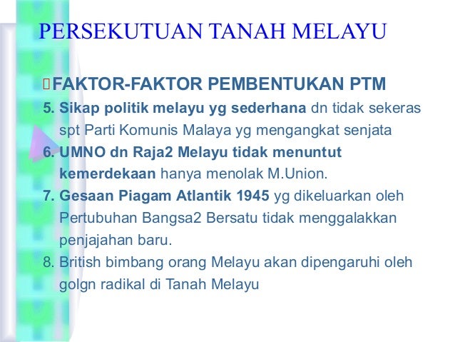 Faktor pembentukan perjanjian persekutuan tanah melayu 1948. Gerakan menuntut kemerdekaan itu bolehlah dikatakan bermula dengan pembentukan persekutuan tanah melayu 1948. Sokongan bekas pegawai pegawai british antara mereka termasuklah sir frank sweetwnham sir r o winstedt sir. Dalam membincangkan faktor faktor yang akan diambil kira bagi tujuan. Yang pernah berkhidmat di tanah melayu sebelum perang.