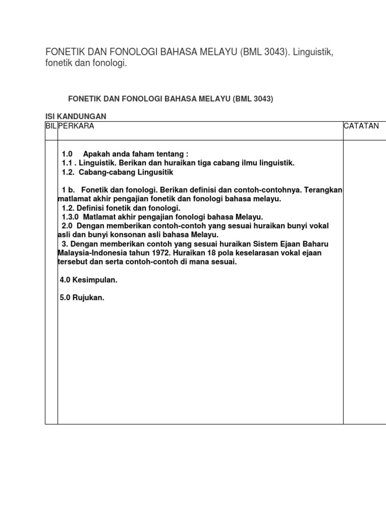 Fonetik dan fonologi bahasa melayu. Nota fonetik dan fonologi bahasa melayu fonetik bahasa melayu. Bunyi bahasa adalah bunyi bunyi yang digunakan dalam bahasa untuk berkomunikasi sumber. Linguistik deskriptif menghuraikan bagaimana bunyi bunyi bahasa itu dituturkan dan bagaimana sistem bahasa itu digunakan dalam bidang fonologi morfologi sintaksis dan segala aspek yang terdapat dalam bahasa melayu. Kandunganperkara muka surata fonetik dan fonologi bahasa melayu 1 0 pengenalan fonetik dan fonologi 1 1 1 definisi fonetik 1 1 2 definisi fonologi 2 1 3 fonetik artikulasi 3 1 4 penghasilan bunyi 6 1 5 bunyi bunyi bahasa 9 1 6 konsonan 10 1 7 vokal 13 1 8 fonetik akustik 15 1 9 fonetik audotori 16b bunyi vokal dan konsonan bahasa melayu 17 2 0 vokal hadapan 19 3 0 vokal tengah 24 4 0 vokal.
