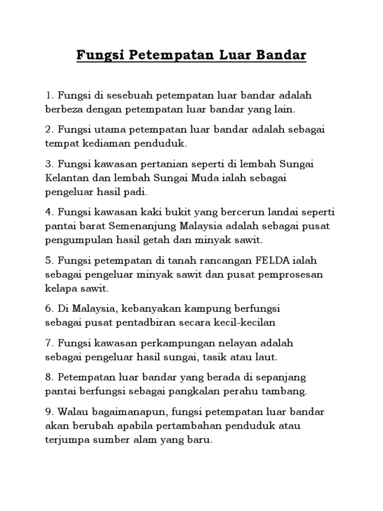 Petempatan luar bandar biasanya terletak berhampiran dengan jalan raya sepanjang pinggir pantai dan sungai. Petempatan awal di malaysia 1 petempatan awal dibina sejak zaman paleolitik. Ngu lehshung no. Fungsi petempatan luar bandar ada 9 iaitu.