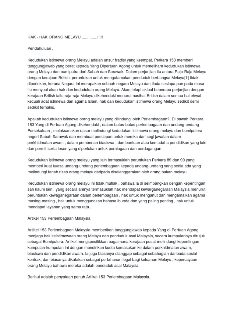 Ini orang melayu dan anak negeri sabah dan sarawak perlu sedar. Hak orang melayu 1. Rakyat malaysia dari mana mana kaum yang mempersoal atau mempertikaikan perkara 153 dalam perlembagaan negara yang mengiktiraf kedudukan dan hak istimewa orang melayu dan bumiputera adalah buta sejarah dan tidak memahami perlembagaan kata pakar sejarah prof emeritus tan sri dr khoo kay kim. Komuniti komuniti lain mempunyai kepentingan sah dalam mendapatkan hak pendidikan tetapi orang melayu mempunyai hak istimewa dalam pendidikan menerusi perkara ini jelas beliau.