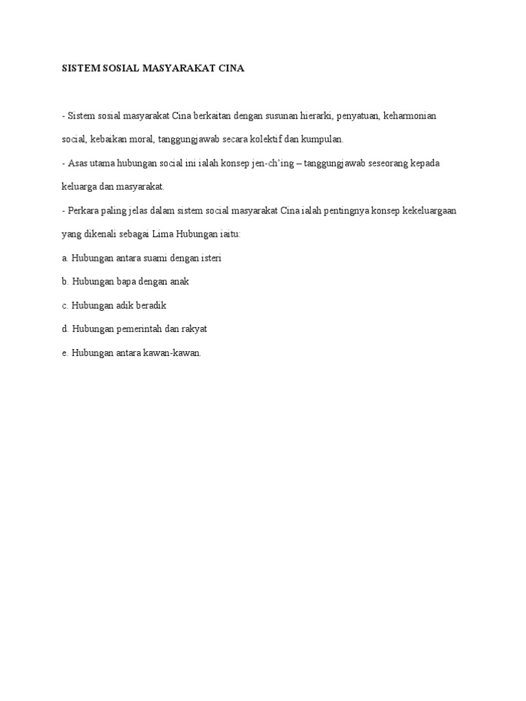 Sistem kemasyarakatan cina berasaskan kpd sistem kekeluargaan. Sistem sosial masyarakat cina sistem social masyarakat cina berkaitan dengan susunan hierarki penyatuan keharmonian social kebaikan moral tanggungjawab secara kolektif dan kumpulan. Organisasi sosial tamadun china susun lapis masyarakat china pada zaman pemerintahan dinasti shang terdiri daripada tiga lapisan tidak termasuk raja. Masyarakat china mempunyai organisasi sosial yang tersusun serta mempunyai lebih daripada 56 etnik.