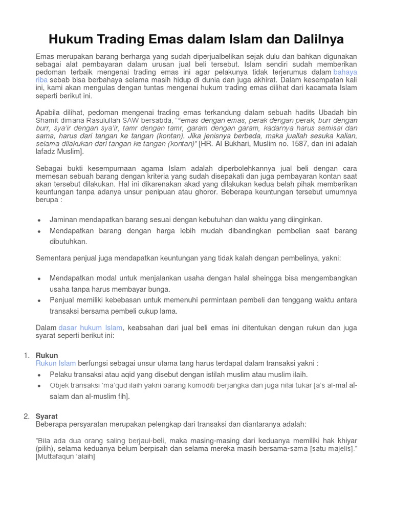 Ini nota ringkas mengani hukum hakam dalam pembelian emas yang saya hasilkan bersempena posting tentang trade in emas yang tular pada julai 2018 yang lepas ada beberapa soalan yang kerap ditanya apabila bercakap soal jual beli atau muamalat dari sudut syara saya wrap up kan macam ini. Lagi jawapan bagi trade in emas lama dengan emas baru. Apabila dilihat pedoman mengenai trading emas terkandung dalam sebuah hadits ubadah bin shamit dimana rasulullah saw bersabda emas dengan emas perak dengan perak burr dengan burr sya ir dengan sya ir tamr dengan tamr garam dengan garam kadarnya harus semisal dan sama harus dari tangan ke tangan kontan jika jenisnya berbeda maka juallah sesuka kalian selama dilakukan dari. Menjawab persoalan trade in emas lama dan tukar kepada emas baru jatuh hukum riba dalam kes ini.