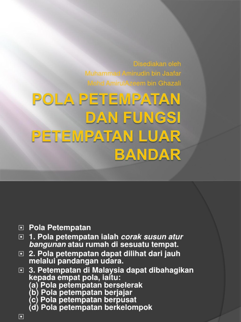 Menjelaskan contoh empat pola petempatan di malaysia. Fungsi petempatan bandar dan luar bandar. Petempatan luar bandar biasanya terletak di kawasan tanah pamah yang rata dan landai kerana kegiatan pertanian sesuai dijalankan di kawasan ini dan mudah untuk dihubungi. Kerajaan governan perkhidmatan pengurusan pentadbiran terdapat di luar bandar.