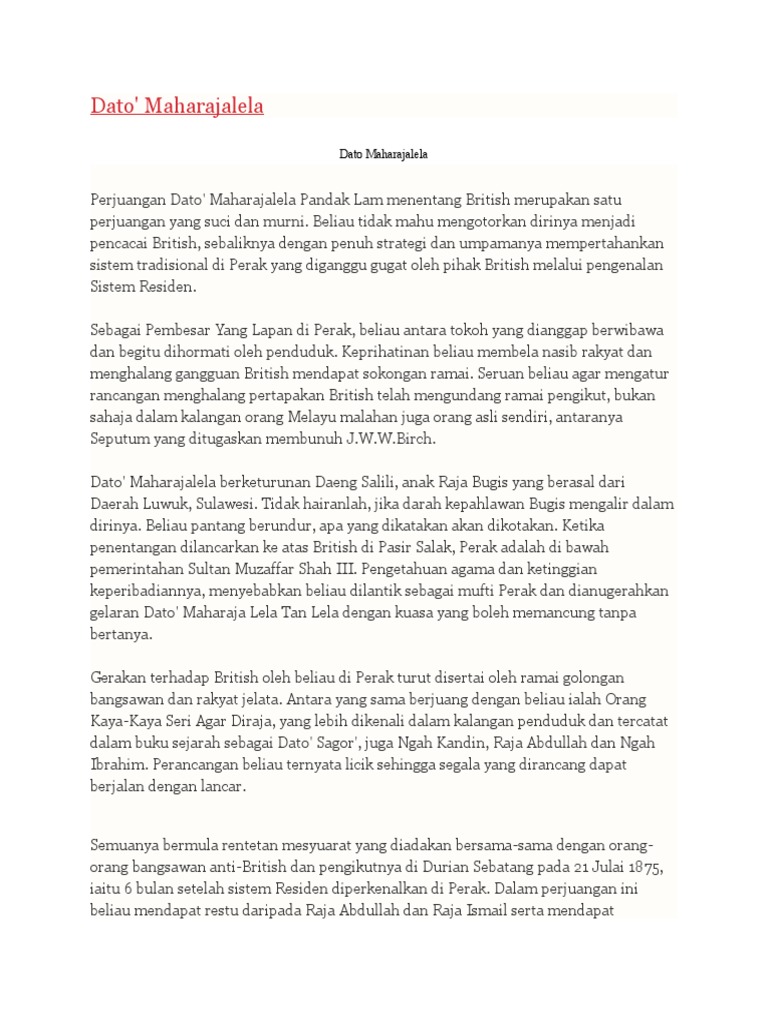 Dato maharaja lela pada 16 oktober 1874 sultan abdullah ngah ibrahim dato maharaja lela dato sagor dan pembesar melayu lain mengadakan pakatan sulit untuk menghapuskan j w w birch pada 21 julai 1875 satu mesyuarat penting diadakan di durian sebatang. Sultan abdullah dan ngah ibrahim dibuang negeri ke pulau seychelles di lautan hindi. Pada 2 november 1875 j w w birch telah sampai di pasir salak untuk menyebarkan surat pengisytiharan hak memungut cukai. 2 1 2d huraikan penentangan yang dilakukan oleh dato maharaja lela ke atas british di perak.
