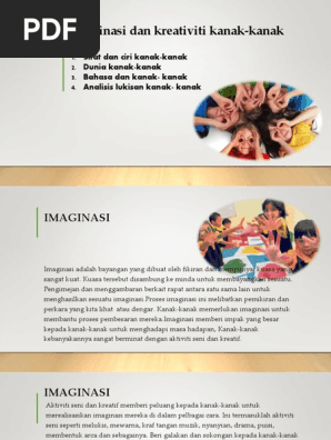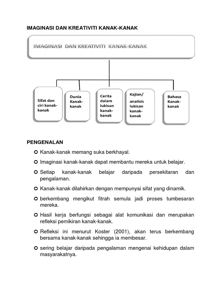 8 1 1 sastera awal kanak kanak sastera adalah hasil kreatif yang menggunakan bahasa yang indah baik. 13 aktiviti yang boleh dilakukan untuk merangsang dan memupuk kreativiti anak. Salah satu model proses kreativiti yang paling awal diperkenalkan oleh graham wallas pada tahun 1926. Ianya memperkembangkan daya imaginasi dan kreativiti kanak kanak dalam pembawakan watak masing masing.