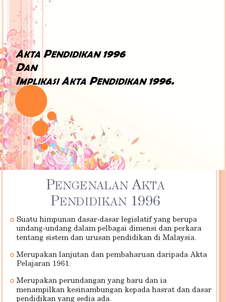 Akta pendidikan 1996 merupakan lanjutan dan pembaharuan dari akta pelajaran 1961 bertujuan memantapkan sistem pendidikan kebangsaan sejajar dengan kehendak dan cita cita malaysia untuk menjadi pusat kecemerlangan pendidikan yang bermutu tinggi dan bertaraf dunia. Akta pendidikan 1996 menampilkan kesinambungan kepada hasrat dan dasar pendidikan yang sedia ada. Guru dan perundangan implikasi penyampaian yang menarik sangat diperlukan. Akta pendidikan 1996 merupakan lanjutan ataupun pembaharuan dari akta pelajaran 1961.