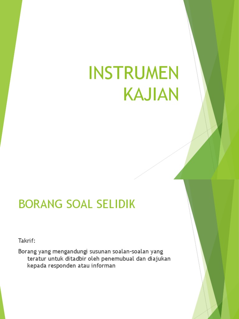 Instrumen kajian cara yang digunakan untuk mengumpulkan data. 3 5 instrumen kajian instrumen utama yang digunakan dalam kajian ialah borang soal selidik. Mereka juga dipanggil sebagai soal selidik tertutup. Jenis skala apa yang kita nak guna bagi menjawab persoalan kajian.