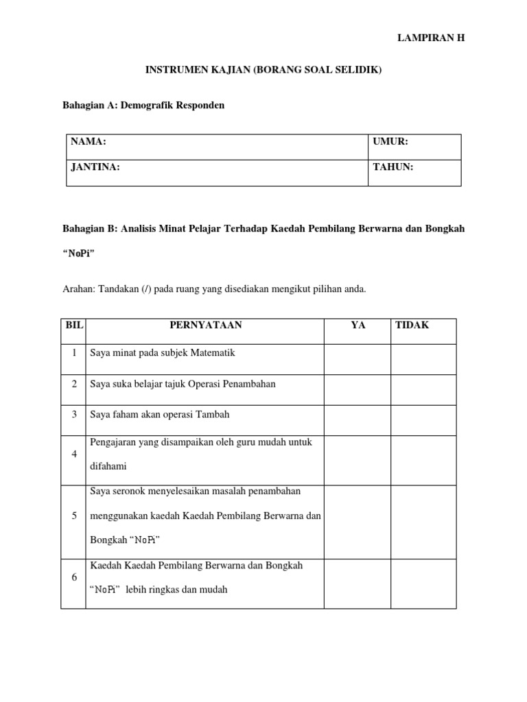 Kebolehpercayaan instrumen soal selidik kajian kuantitatif kebolehpercayaan instrumen ialah suatu nilai ukuran untuk menentukan ketekalan skor setiap item. A borang soal selidik guru guru yang mengajar subjek bahasa arab. Menggunakan instrumen standard yang sedia ada. Kaedah yang digunakan oleh pengkaji ialah kaedah soal selidik kaedah pemerhatian dan kaedah temubual.