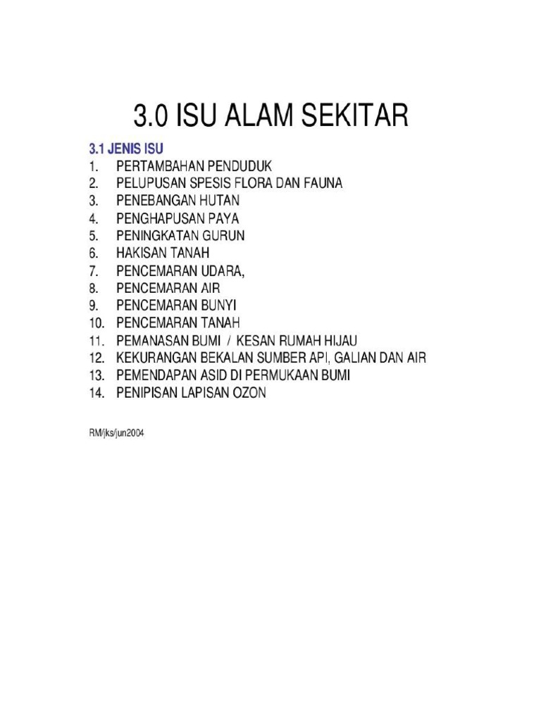 2 0 isu isu alam sekitar secara tanpa kita sedar pencemaran mengubah persekitaran sehingga keseimbangan alam terjejas. Antaranya tragedi highland tower pos dipang isu gua tempurung pembuangan sisa toksik di sungai gatom di johor isu pencemaran arsenik di loji rawatan air sungai ganda di gerik serta terbaru tragedi sungai kim kim fasa 1 dan fasa 2. Satu keseimbangan wujud antara manusia dan organisma dengan alam. Boleh kita fahami maksud pencemaran disini ialah pembuangan secara tidak terkawal dan pengumpulan bahan bahan yang tidak sesuai kepada kehidupan di persekitaran kita.