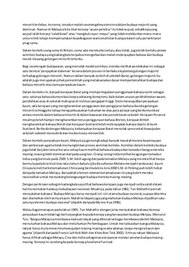 Justeru itu kepelbagaian kaum ini haruslah diraikan dan sebagai rakyat malaysia kita perlu saling tolong menolong antara kaum bagai aur dengan tebing untuk sama sama hidup dalam persekitaran hidup yang sihat dan aman makmur. Konsep 1 malaysia membawa aspirasi dan harapan untuk mengeratkan hubungan antara kaum bagi memastikan rakyat malaysia dapat menjalin perpaduan yang erat. Mengambil contoh peperangan amerika syarikat iran isu kashmir melibatkan india pakistan dan rohingya di myanmar ramlah menegaskan tragedi boleh berlaku seandainya sentimen kaum agama diapi apikan. Dr rahmat ghazali usaha kerajaan untuk mewujudkan sistem amaran konflik perkauman sebagaimana yang dicanangkan tahun lalu mengheret beberapa persepsi terhadap pencapaian negara dalam usaha menyemarakkan perpaduan kaum.