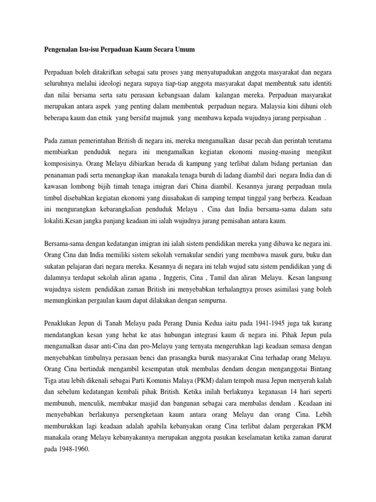 Isu perpaduan di malaysia perpaduan merupakan perkara yang tidak asing lagi bagi masyarakat negara kita yang terdiri daripada pelbagai bangsa kaum dan etnik.
