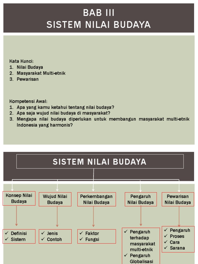 Jenis jenis nilai budaya. Budaya jenis ini ialah idea pandangan kepercayaan adat resam dan sebagainya. Nilai nilai budaya dalam masyarakat dapat dicirikan dengan adanya benda benda yang menjadi kebiasaan keyakinan masyarakat simbol dan karakteristik yang berbeda satu sama lain. Pengertian ciri fungsi unsur macam macam kebudayaan indonesia sangat beragam dan juga hadir dalam banyak bentuk seperti karakteristik kemajemukan yang dimiliki oleh negara ini. Beberapa jenis nilai antara lain sebagai berikut.