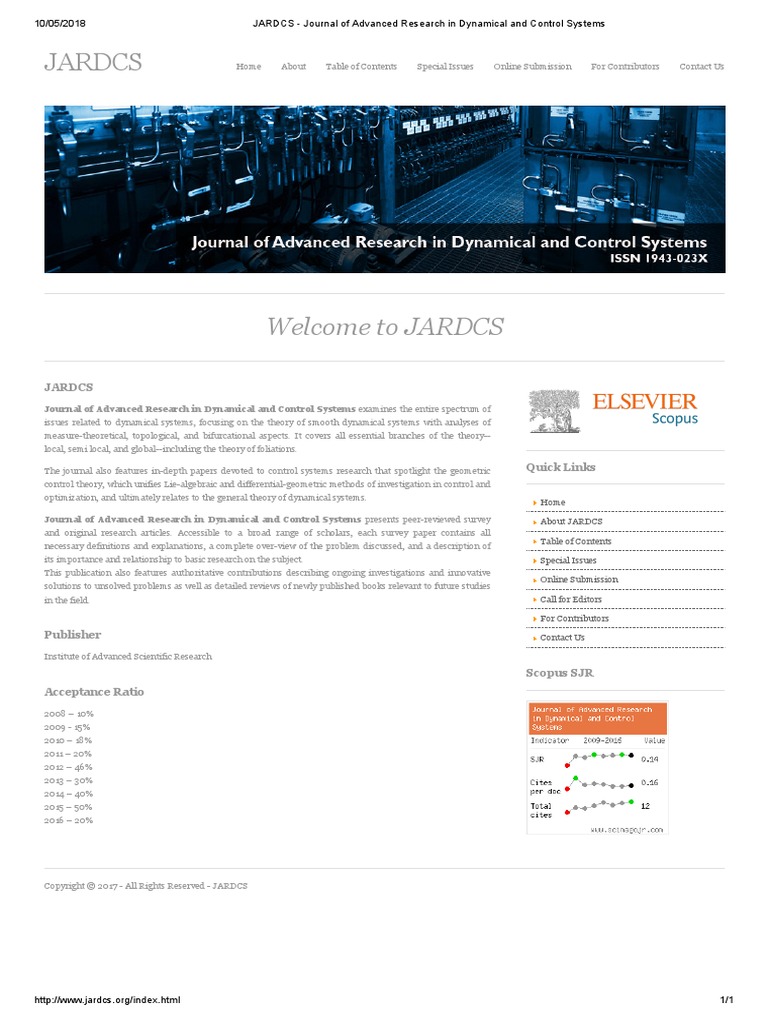 Journal of advanced research in dynamical and control systems. The scientific journal journal of advanced research in dynamical and control systems is included in the scopus database. Those documents other than research articles reviews and conference papers. Journal of advanced research in dynamical and control systems jardcs issn. Accessible to a broad range of scholars each survey paper contains all necessary definitions and explanations a complete over view of the problem discussed and a description of its importance and relationship to basic research on the subject.