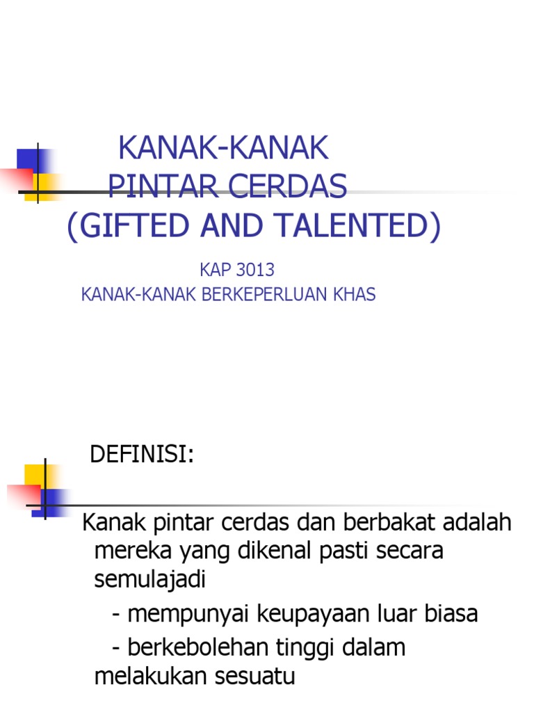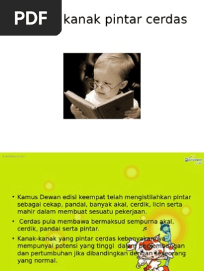Apakah yang dimaksudkan kanak kanak pintar cerdas. Mereka yang lebih tinggi tahap kecerdasannya berbanding kanak kanak lain menghadapi masalah dalam penyesuaian diri dengan rakan sebaya bee 2000. Di malaysia program bagi kanak kanak berkeperluan khas telah diberi banyak penumpuan namun usaha masih kurang dijalankan bagi memberi tumpuan khusus kepada golongan kanak kanak pintar cerdas ini. Peranan ibu bapa pendidik dan masyarakat amat diperlukan untuk membentuk kanak kanak pintar cerdas ini menjadi satu aset yang paling berharga dalam masyarakat.