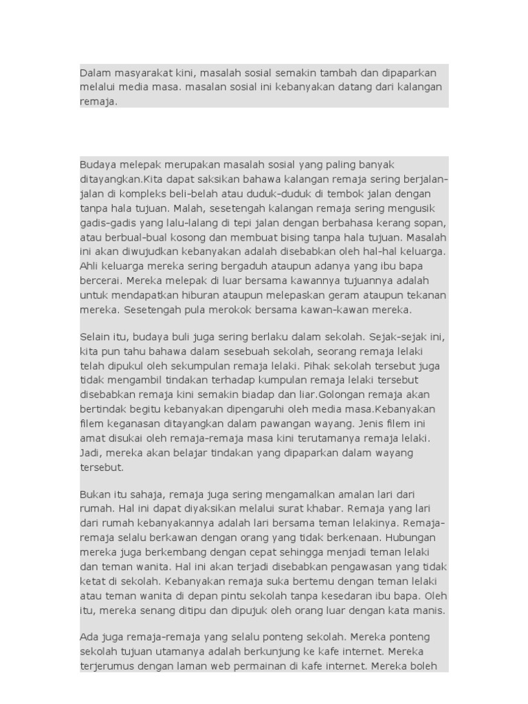 Karangan masalah sosial di kalangan remaja. Karangan masalah sosial dalam kalangan remaja punca kesan dan langkah langkah masalah sosial dalam kalangan remaja merupakan fenomena yang semakin membimbangkan kita pada hari ini. Data dan statistik banyak menunjukkan keruntuhan akhlak di kalanagan remaja di negara ini adalah semakin serius. Sedasawarsa ini sering meniti dari bibir ke bibir umat manusia di segenap penjuru dunia tentang masalah sosial dalam kalangan remaja seperti merempit melepak penyalahgunaan dadah pergaulan bebas dan sebagainya. Seterusnya masalah ponteng sekolah.