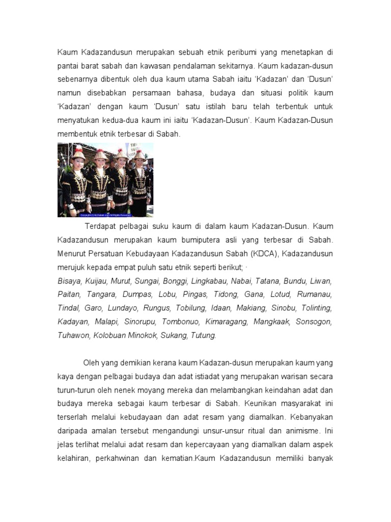 Kaum kadazan dusun merupakan nama kaum bumiputera asli yang terbesar di sabah yang merupakan 1 3 dari jumlah penduduk sabah. Mereka biasanya tinggal di daerah tenom pensiangan dan keningau. Kaum kadazan dusun merupakan nama kaum bumiputera asli yang terbesar di sabah. Sebagai tambahan kaum cina merupakan kumpulan penduduk bukan asli yang terbesar.