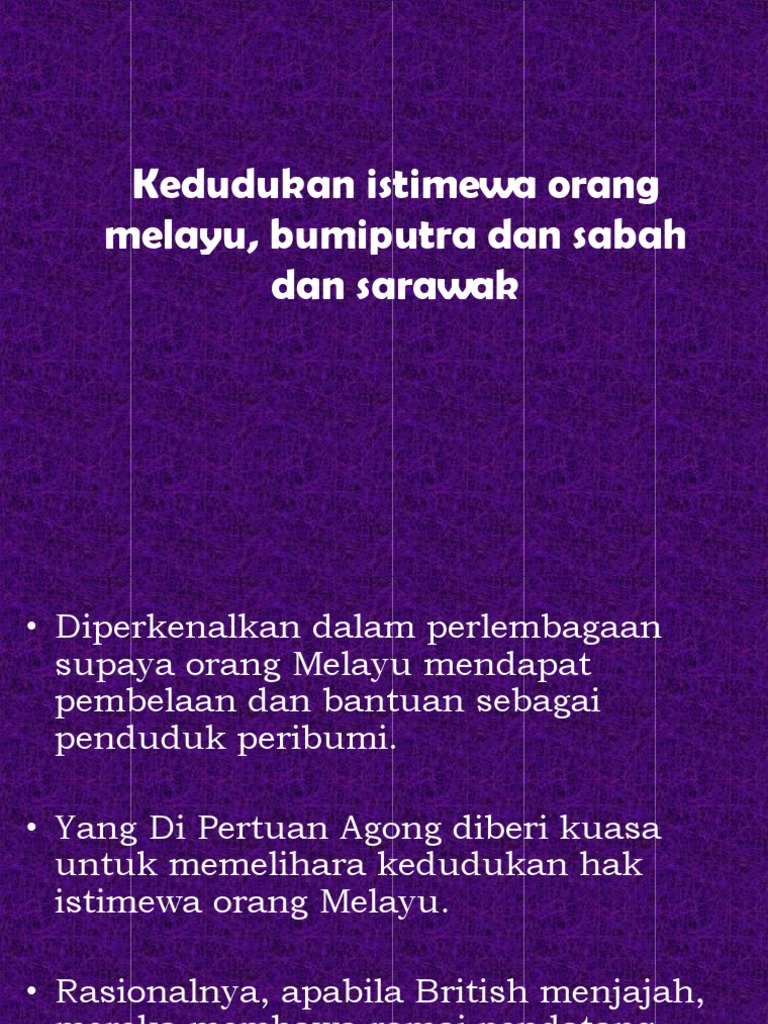 1 berkenaan pengiktirafan british terhadap asal usul kerajaan tanah melayu sejak 1895 harus juga diingati fakta sejarah bahawa pihak. Kedudukan istimewa orang melayu ini tidak mutlak bahawa ia di seimbangkan dengan. Kedudukan istimewa orang melayu yang lain termasuklah peruntukan perkara 89 dan 90 yang memberi kuat kuasa undang undang perlembagaan kepada undang undang yang sedia ada yang melindungi tanah rizab orang melayu daripada diselenggarakan oleh orang bukan melayu. Hak hak istimewa orang melayu ini bukan merupakan peraturan baru malahan hak hak ini telah tercatat dalam perjanjian persekutuan tanah melayu 1948 dan perjanjian perjanjian ini telah pun diamalkan di negeri negeri melayu yang tidak.
