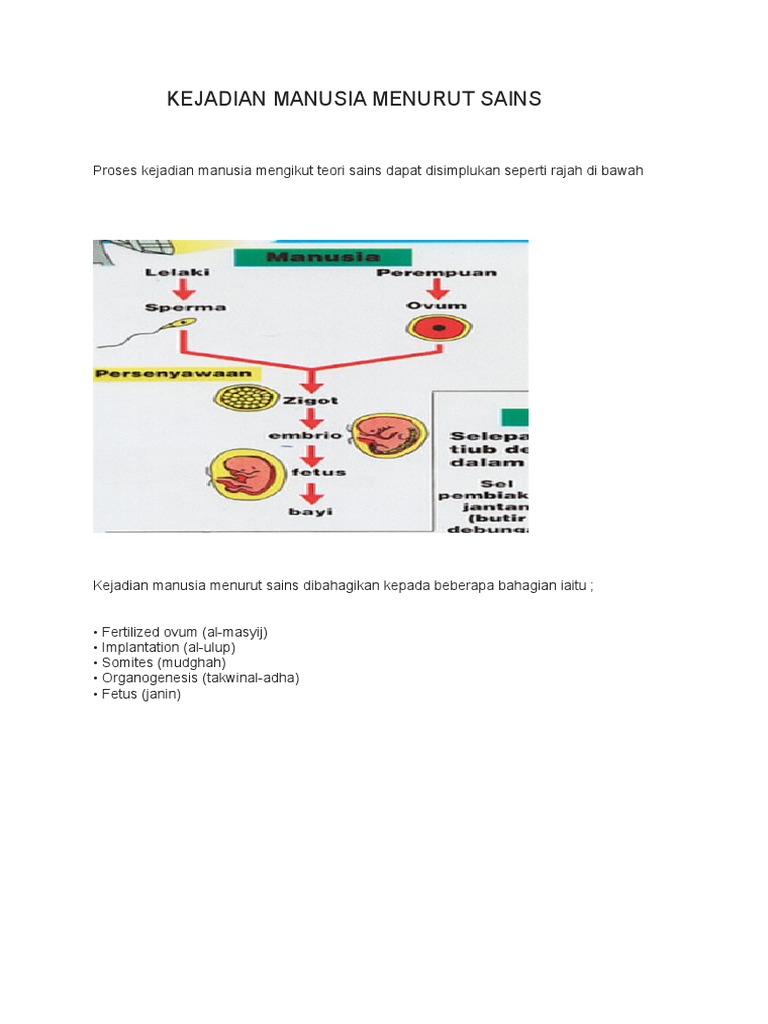 Proses kejadian manusia mengikut teori sains dapat disimplukan seperti rajah di bawah. Proses tahapan penciptaan manusia و ل ق د خ ل ق ن ا ال إ ن س ان م ن س ل ال ة م ن ط ين. Teori sains menggariskan bayi yang di dalam kandungan akan menghrungi tiga tahap utama iaitu pre embrionik embrionik dan fetus. Ada banyak proses kejadian manusia mulai dari diciptakannya nabi adam siti hawa hingga keturunan adam dan hawa yaitu manusia sekarang.